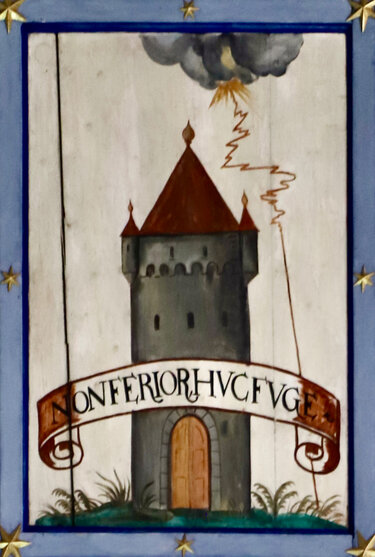 Neben einem Turm schlägt ein Blitz ein. NON FERIOR, HUC FUGE.