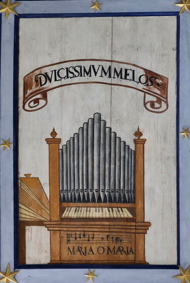 Eine Orgel; unterhalb des Spieltisches Noten mit den Worten MARIA O MARIA. DULCISSIMUM MELOS. Das süsseste Lied.