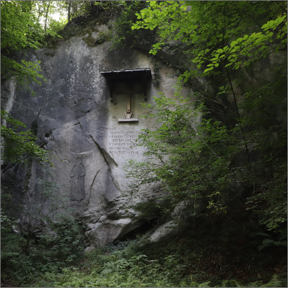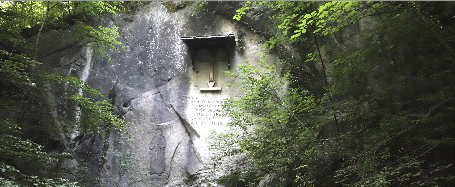 Der Wallfahrtsort entstand aus der abgeschiedenen Einsiedelei eines Waldbruders. «Zwei Steinwurf» unterhalb der heutigen Kirche hatte sich der Kartäuser Johann Wagner 1489, von einem überhängenden Felsen geschützt, in einer Art Höhle niedergelassen. Heute erinnern dort ein Holzkreuz und eine Inschrift im Fels an ihn. Ein kleiner beschilderter Weg führt unterhalb der Kirche zur Sandsteinwand.