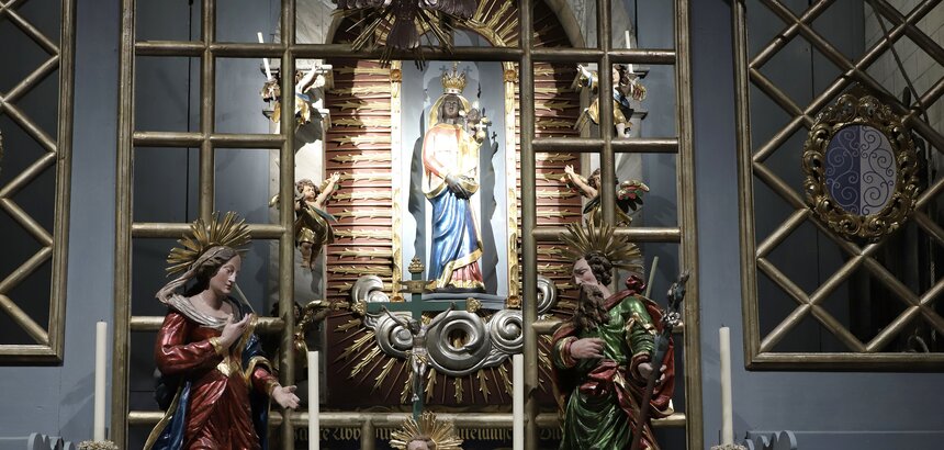 Wer hier hereintritt besucht die Heilige Familie in ihrem Wohnhaus. Die Loretokapelle ist eine masstabsgetreue Nachbildung des Originals aus Nazareth, heute in Loreto, Italien. Das Altargitter trennt den Wohnraum von der schmalen Küche. Dort zeigt sich den Pilgern die schwarze Loretomadonna. Auf der Leuchterbank steht die Heilige Familie, über ihnen die Heilig-Geist-Taube und segnend Gottvater. Unter dem Verkündigungsfenster sind Ex-Voto-Tafeln angebracht. Diese zeugen von Gebets-Erhörungen und Heilungen. Es lohnt sich, hier im Gebet still zu werden und das grosse Geheimnis der Menschwerdung Gottes zu spüren.
