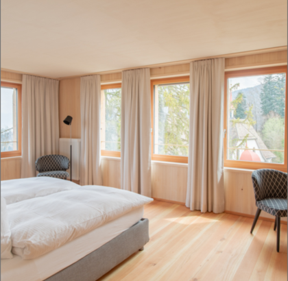 Das vorwiegend aus einheimischen Hölzern 2019 erstellte Gasthaus Hergiswald von Architekt Gion Caminada lädt zum Geniessen und Verweilen ein.