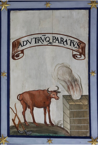 Ein Ochse zwischen einem Pflug und einem Altar. AD UTRUMQUE PARATUS.