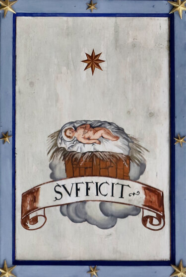 Über dem in einer Krippe liegenden Jesuskind leuchtet ein grosser Stern. SUFFICIT. Er genügt.