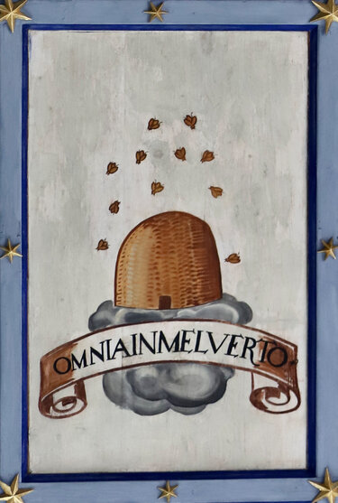 Bienen umschwärmen einen Bienenkorb. OMNIA IN MEL VERTO.