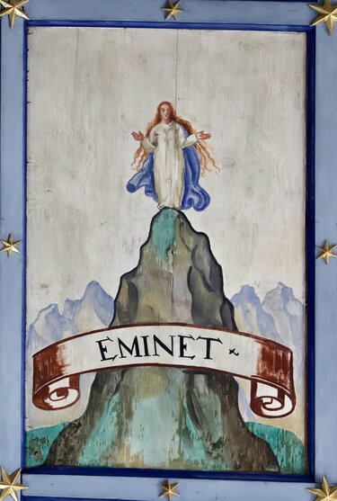Ein hoher felsiger Berg, darauf stehend Maria mit blauem Mantel und ausgebrei-teten Armen. EMINET. Sie ragt heraus.