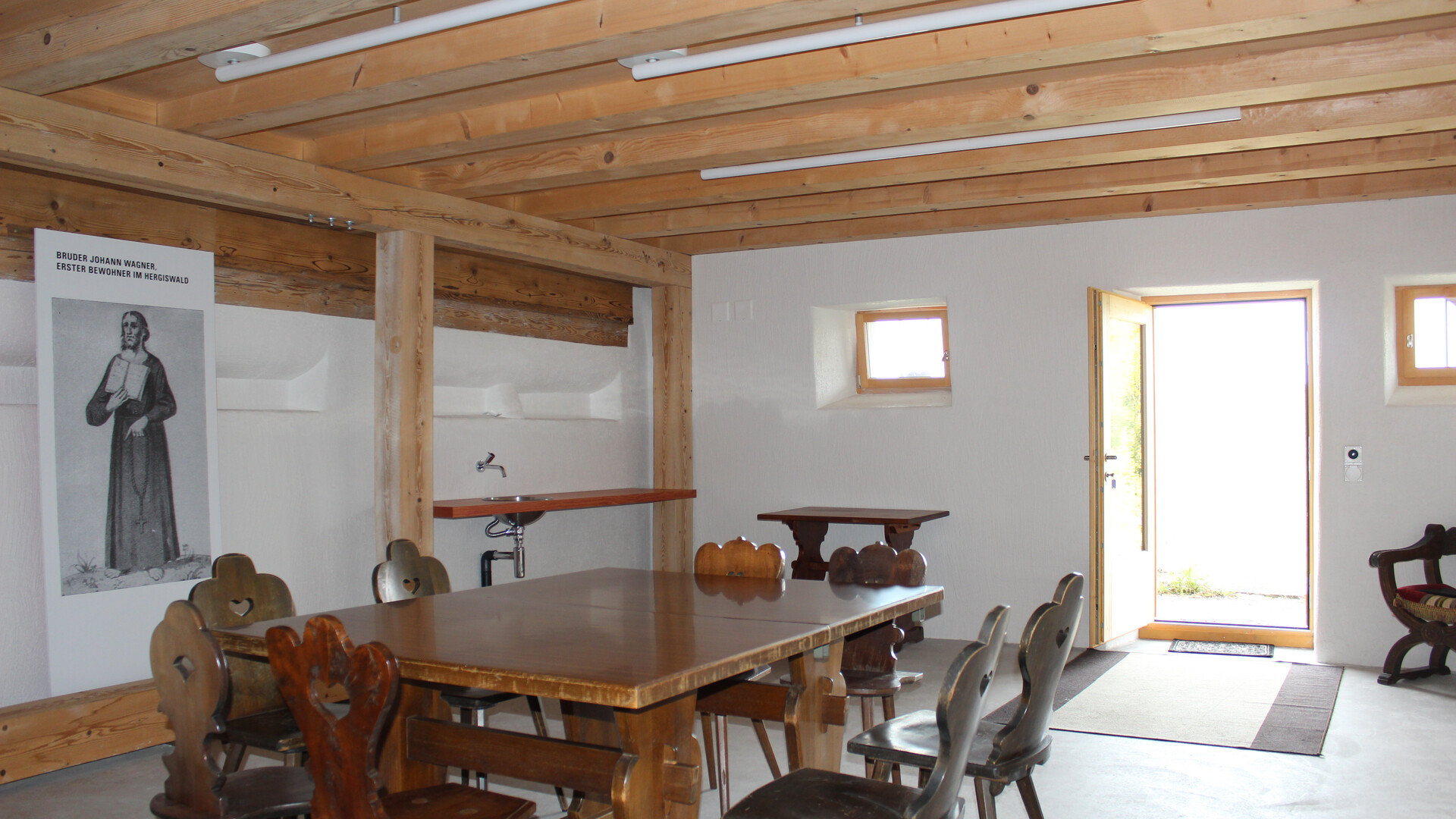 Vom Architekten Gion Caminada erdacht, sollte das Pilgerstübli im Untergeschoss des Gasthauses ein offener Raum sein, in dem sich die Pilger wärmen, deren Socken trocknen und der Proviant verzehrt werden können.