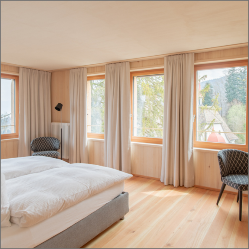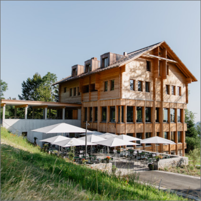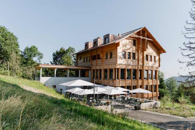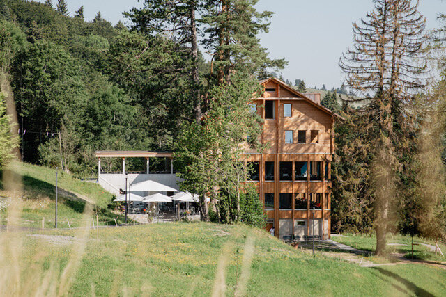 Das vorwiegend aus einheimischen Hölzern 2019 erstellte Gasthaus Hergiswald von Architekt Gion Caminada lädt zum Geniessen und Verweilen ein.
